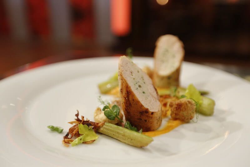 Position the chicken breast fillet and make a deep cut with a sharp knife to create the space for the stuffing. Mix meat cuts, egg white, spring onions and cream until you get a smooth mixture. Spice the mixture and put it in the bag for dressing. Fill the hole with the mousse. Wrap the breast fillet in PVC foil, boil in hot water and then quickly roast on olive oil. Add a bit of butter in the pan once the meat is nicely roasted on both sides. Pour melted butter a couple of times over the chicken breast fillet. Finish roasting the meat in an oven.